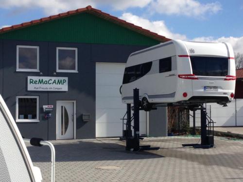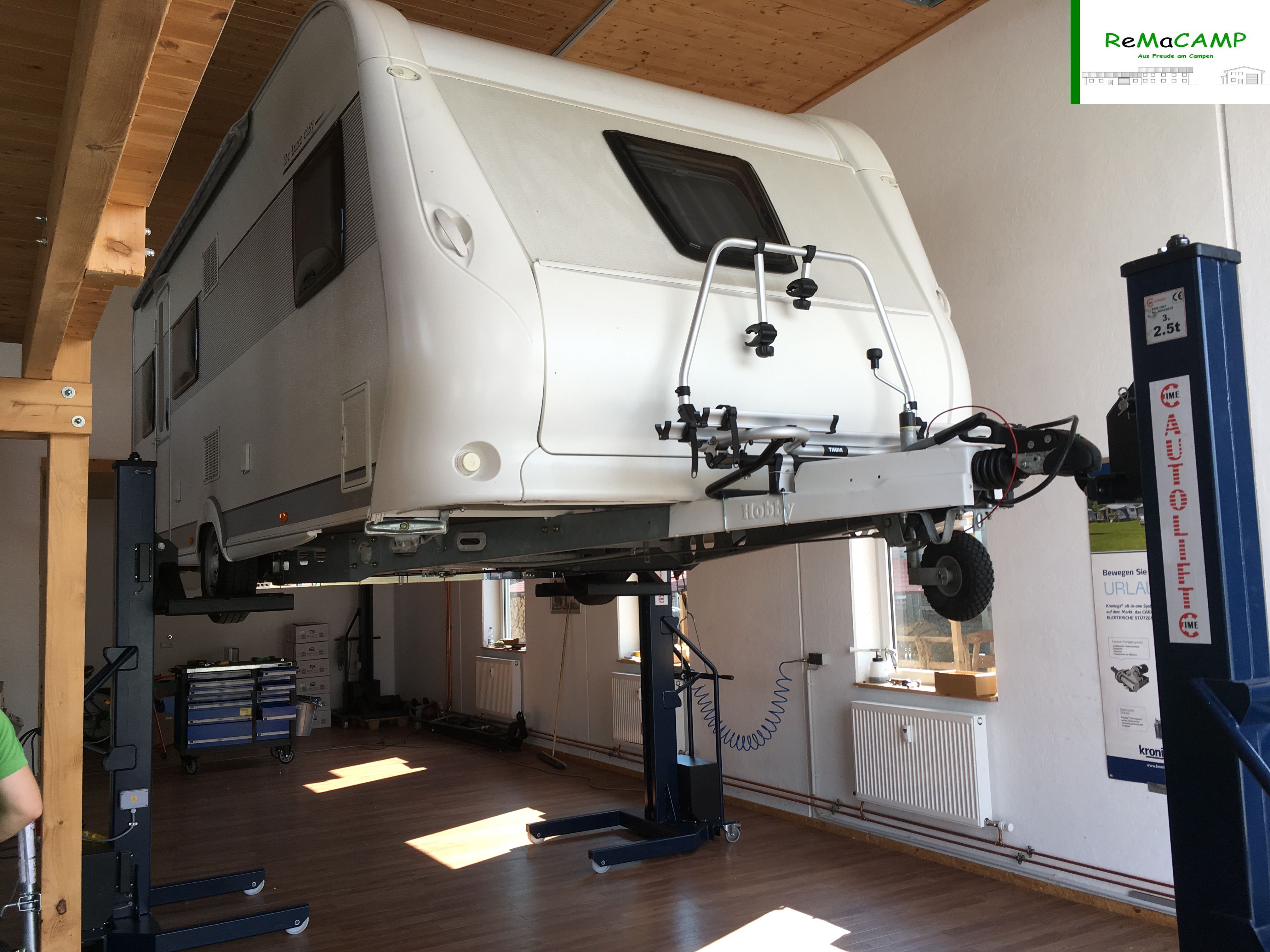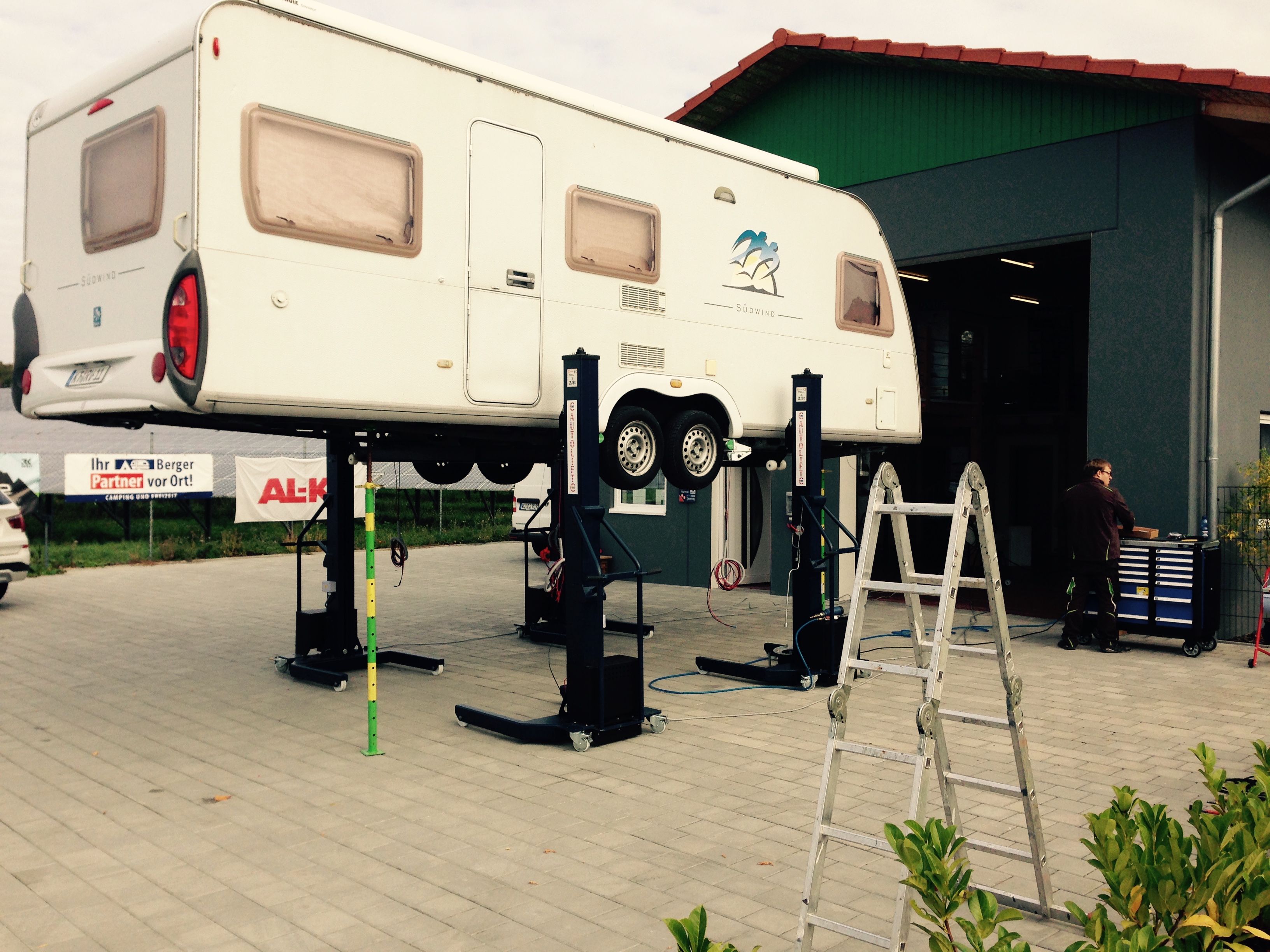 Auf öffentlichen Straßen und Flächen ist das aus guten Gründen verboten! Bei uns wird Ihr Caravan mit einer spez. Hebebühne (Radgreiferanlage) gehoben.